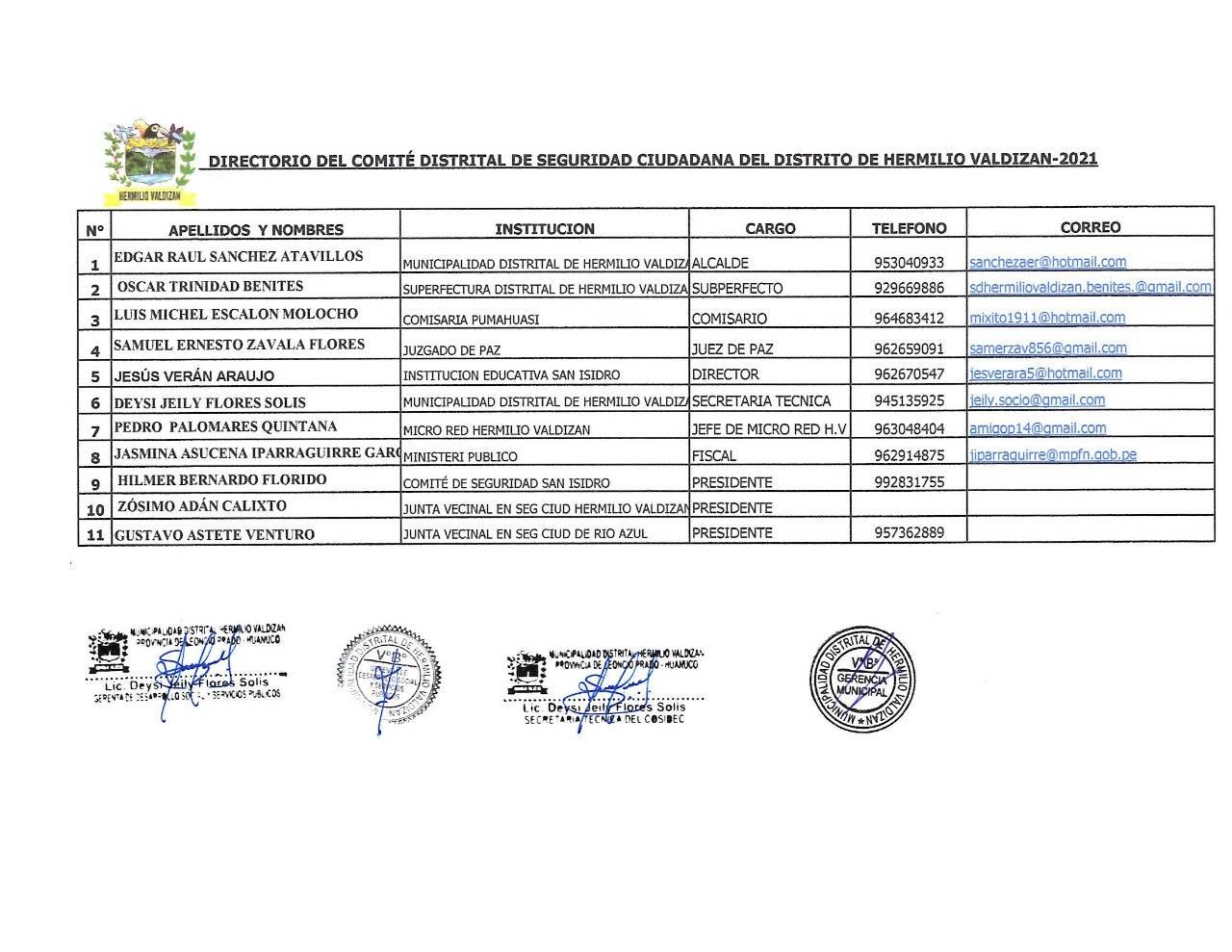 DIRECTORIO DEL COMITÉ DISTRITAL DE SEGURIDAD CIUDADANA DEL DISTRITO DE HERMILIO VALDIZÁN-2021
